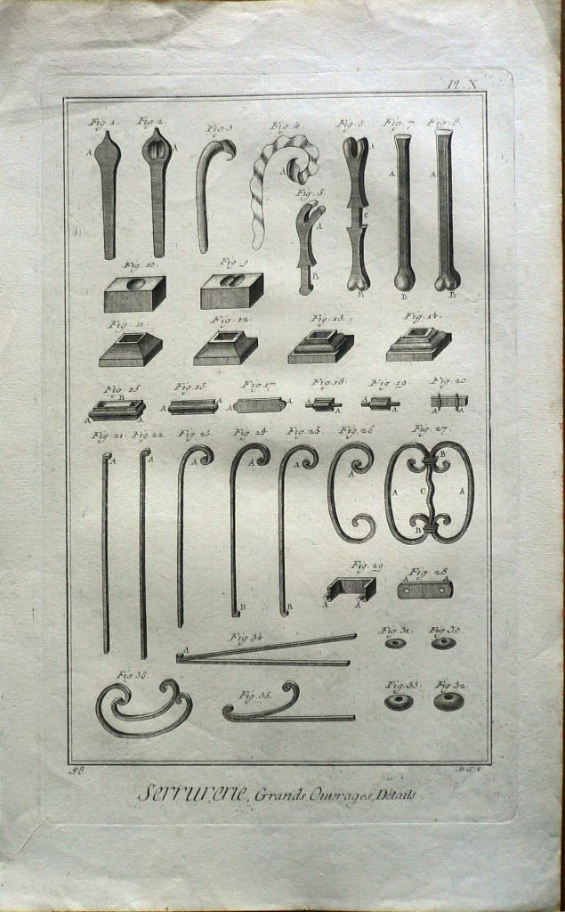 Sono rappresentati in dettaglio alcui oggetti prodotti dal fabbro. Ogni figura è connotata da: “fig.”; ogni parte è indicata con lettere. Filigrana: il sole. E’ presente numerazione della stampa: Pl.X.-58. Il bordo superiore, inferiore e destro sono colorati in rosso.