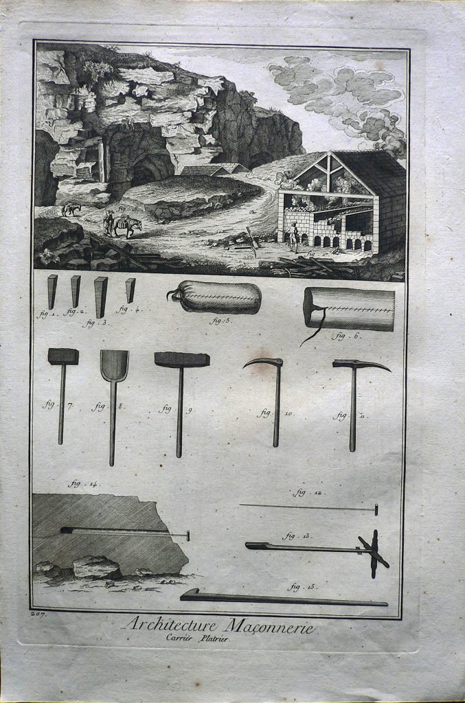 La stampa fa parte di una serie di incisioni (345) tratte dall'”Enciclopedia o Dizionario ragionato delle scienze, delle arti e dei mestieri (Encyclopédie ou Dictionnaire raisonné des sciences, des arts et des métiers”). L’enciclopedia fu pubblicata nel XVIII secolo (il primo tomo è del 1751, l’ultimo del 1772), in lingua francese, da un consistente gruppo di intellettuali sotto la direzione di Denis Diderot e con la collaborazione di Jean-Baptiste Le Rond d’Alembert. La sua introduzione, il Discorso Preliminare, è considerata un’importante esposizione degli ideali dell’Illuminismo, nel quale viene esplicitato l’intento dell’opera di incidere profondamente sul modo di pensare e sulla cultura del tempo: “l’opera che iniziamo […] ha due scopi: in quanto enciclopedia, deve esporre quanto più è possibile l’ordine e la connessione delle conoscenze umane; in quanto Dizionario ragionato delle scienze, delle arti e dei mestieri, deve spiegare i principi generali su cui si fonda ogni scienza e arte, liberale o meccanica, e i più notevoli particolari che ne costituiscono il corpo e l’essenza”. Essa costituì il più ponderoso e consapevole compendio – in un certo senso un vero e proprio manifesto – rappresentativo della visione del mondo promossa dal movimento filosofico e culturale passato alla Storia come Illuminismo e finì per incarnare il concetto stesso di enciclopedia come summa complessiva e sistematica delle conoscenze di un’intera cultura, laddove l’impiego di una lingua nazionale si afferma definitivamente come mezzo di descrizione ordinata dell’intero universo del sapere. Le prime ristampe italiane dell’Encyclopédie, in lingua francese, apparvero nella Repubblica di Lucca (tra il 1758 e il 1776) e a Livorno (1770-1778).