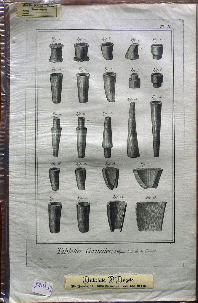 Sono rappresentati parti di corno; tra cui alcuni in sezione. Ogni figura è connotata da: “fig.” E’ presente numerazione della stampa: Pl.II.-111. Il bordo superiore, inferiore e destro sono colorati in rosso; la stampa è contenuta in una busta trasparente sigillata, classificata come:”Card 12″.