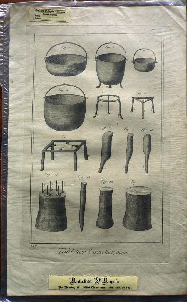 Sono rappresentati gli utensili per la lavorazione del corno. Ogni figura è connotata da: “fig.”; ogni parte è indicata da lettere. Filigrana: BEINETTE. E’ presente numerazione della stampa: Pl.X.-119. Il bordo superiore, inferiore e destro sono colorati in rosso; la stampa è contenuta in una busta trasparente sigillata.