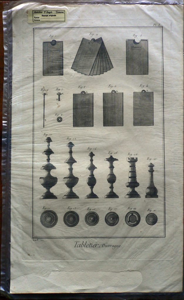 La stampa fa parte di una serie di incisioni (345) tratte dall'”Enciclopedia o Dizionario ragionato delle scienze, delle arti e dei mestieri (Encyclopédie ou Dictionnaire raisonné des sciences, des arts et des métiers”). L’enciclopedia fu pubblicata nel XVIII secolo (il primo tomo è del 1751, l’ultimo del 1772), in lingua francese, da un consistente gruppo di intellettuali sotto la direzione di Denis Diderot e con la collaborazione di Jean-Baptiste Le Rond d’Alembert. La sua introduzione, il Discorso Preliminare, è considerata un’importante esposizione degli ideali dell’Illuminismo, nel quale viene esplicitato l’intento dell’opera di incidere profondamente sul modo di pensare e sulla cultura del tempo: “l’opera che iniziamo […] ha due scopi: in quanto enciclopedia, deve esporre quanto più è possibile l’ordine e la connessione delle conoscenze umane; in quanto Dizionario ragionato delle scienze, delle arti e dei mestieri, deve spiegare i principi generali su cui si fonda ogni scienza e arte, liberale o meccanica, e i più notevoli particolari che ne costituiscono il corpo e l’essenza”. Essa costituì il più ponderoso e consapevole compendio – in un certo senso un vero e proprio manifesto – rappresentativo della visione del mondo promossa dal movimento filosofico e culturale passato alla Storia come Illuminismo e finì per incarnare il concetto stesso di enciclopedia come summa complessiva e sistematica delle conoscenze di un’intera cultura, laddove l’impiego di una lingua nazionale si afferma definitivamente come mezzo di descrizione ordinata dell’intero universo del sapere. Le prime ristampe italiane dell’Encyclopédie, in lingua francese, apparvero nella Repubblica di Lucca (tra il 1758 e il 1776) e a Livorno (1770-1778).