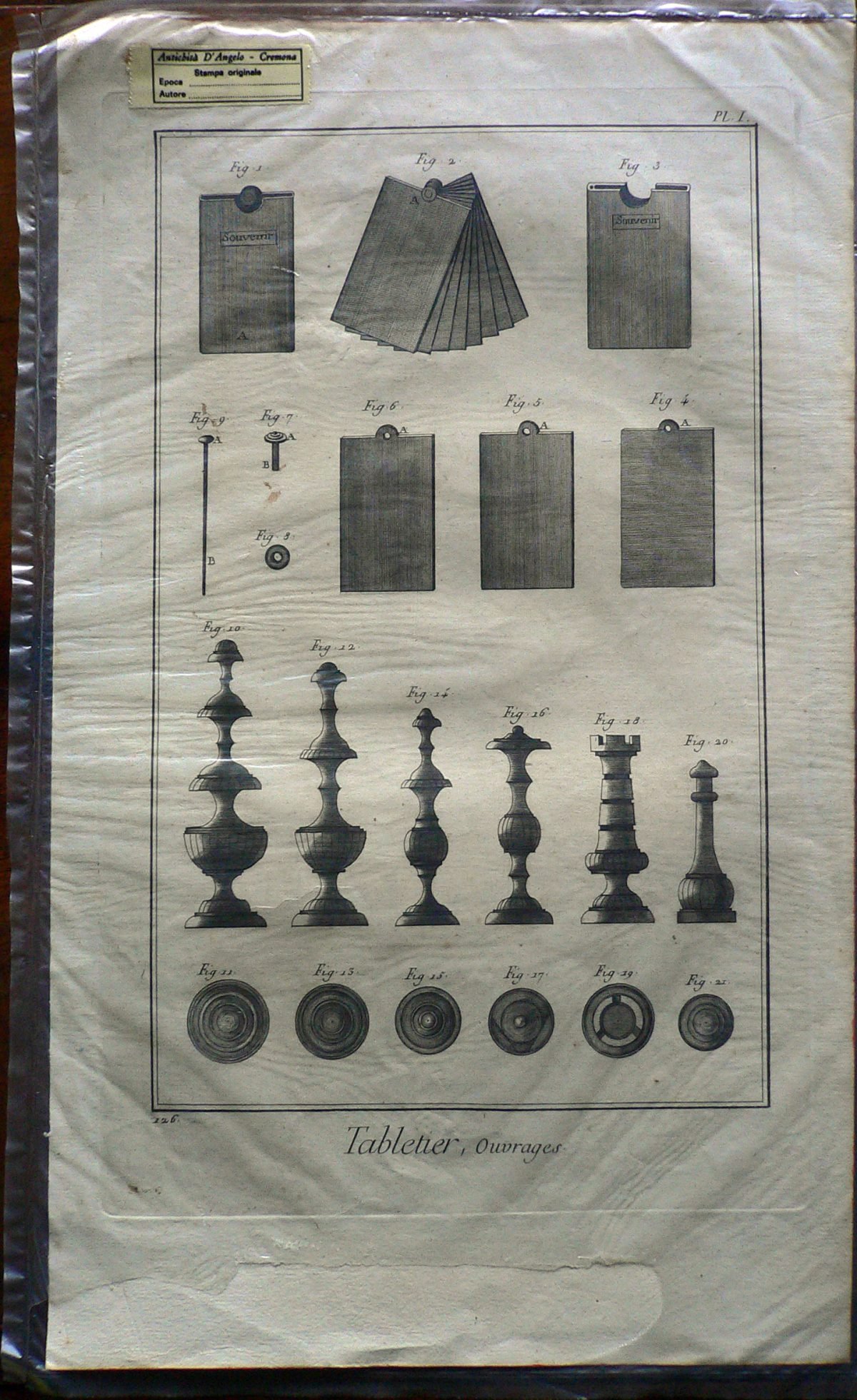 Sono rappresentati vari prodotti della lavorazione del corno:scatole, tavole e scacchi; ogni figura è connotata da: “fig.”; ogni parte è indicata da lettere. Filigrana: BEINETE. E’ presente numerazione della stampa: Pl.I.-126. Il bordo superiore, inferiore e destro sono colorati in rosso; la stampa è contenuta in una busta trasparente sigillata.