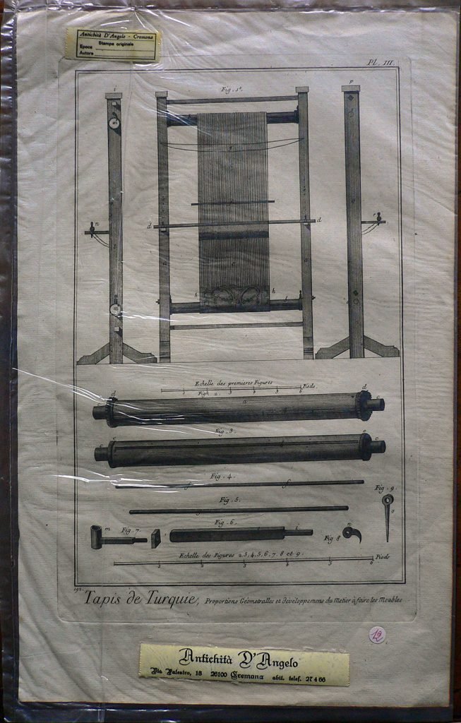 E’ rappresentato il macchinario per realizzare i tappeti e alcune sue parti. Ogni figura è connotata da: “fig.”; ogni parte da lettere. Filigrana: BEINETE. E’ presente numerazione della stampa: Pl.III.-192 e due scale metriche; il bordo superiore, inferiore e dx sono colorati in rosso; la stampa è contenuta in una busta trasparente e sigillata, classificata:”12″.