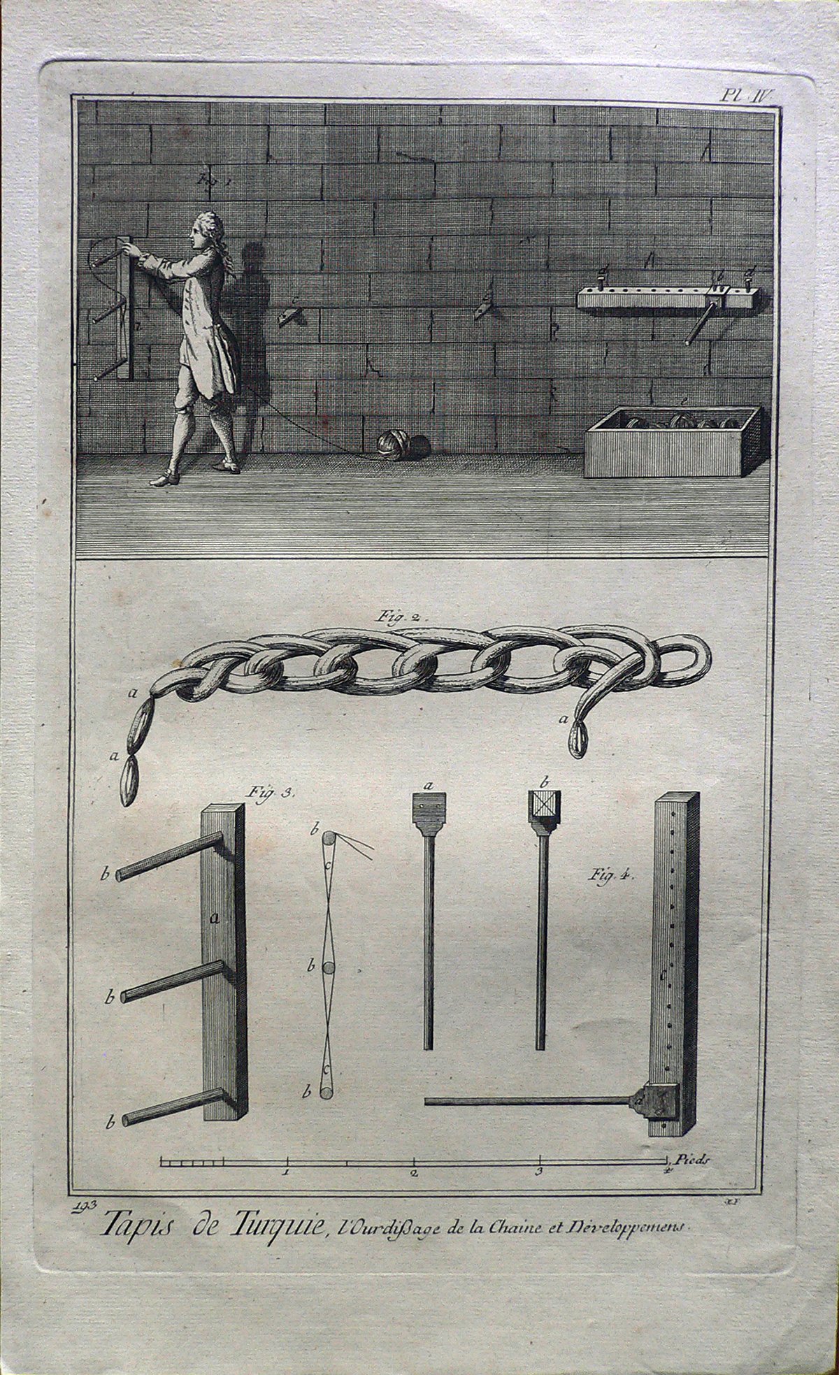 Nel primo riquadro un uomo sta passando un filo attorno a dei paletti appesi al muro. Sotto gli attrezzi utilizzati. Ogni figura è connotata da: “fig.”; ogni parte da lettere. Filigrana: BEINETE. E’ presente numerazione della stampa:Pl.IV.-193 e scala metrica. In alto a sinistra, in matita: 69/12.