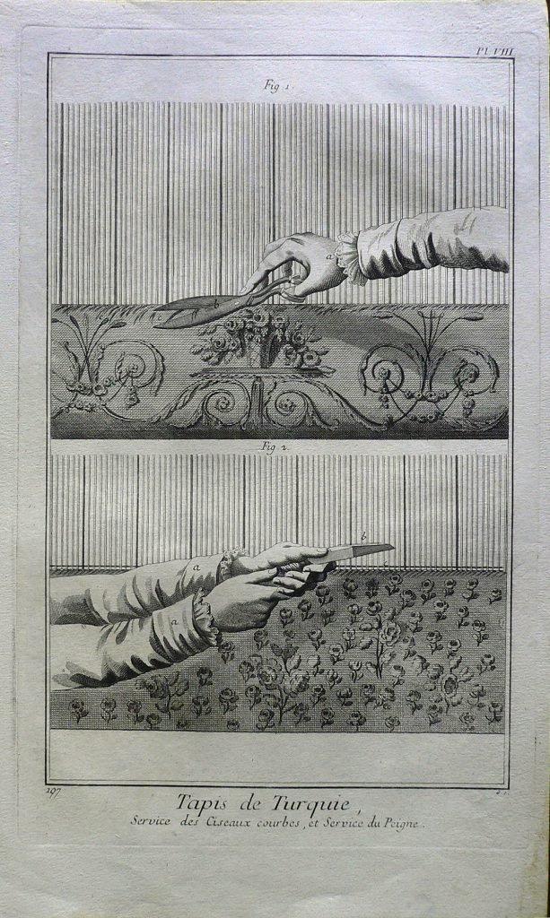 sono rappresentati due ulteriori passaggi per la realizzazione dei tappeti. Ogni figura è connotata da: “fig.”; ogni parte da lettere. Filigrana: il sole. E’ presente numerazione della stampa: Pl.VIII.-197 e scala metrica. In alto a sinistra, in matita: 65/12 e 15 ( cerchiato ); timbro Collezione Piero Malossi.