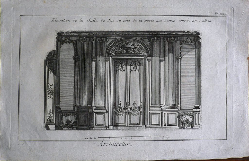 Alzato di parete di salone: al centro porta incornicata da lesene che si concludono con una lunetta decorata. La figura è connotata da :”fig.” Scala metrica (“echelle de Pieds”). E’ presente numerazione della stampa: Pl. XXXI.-175. Sul retro, a matita: 123/12; cerchio; timbro Piero Malossi