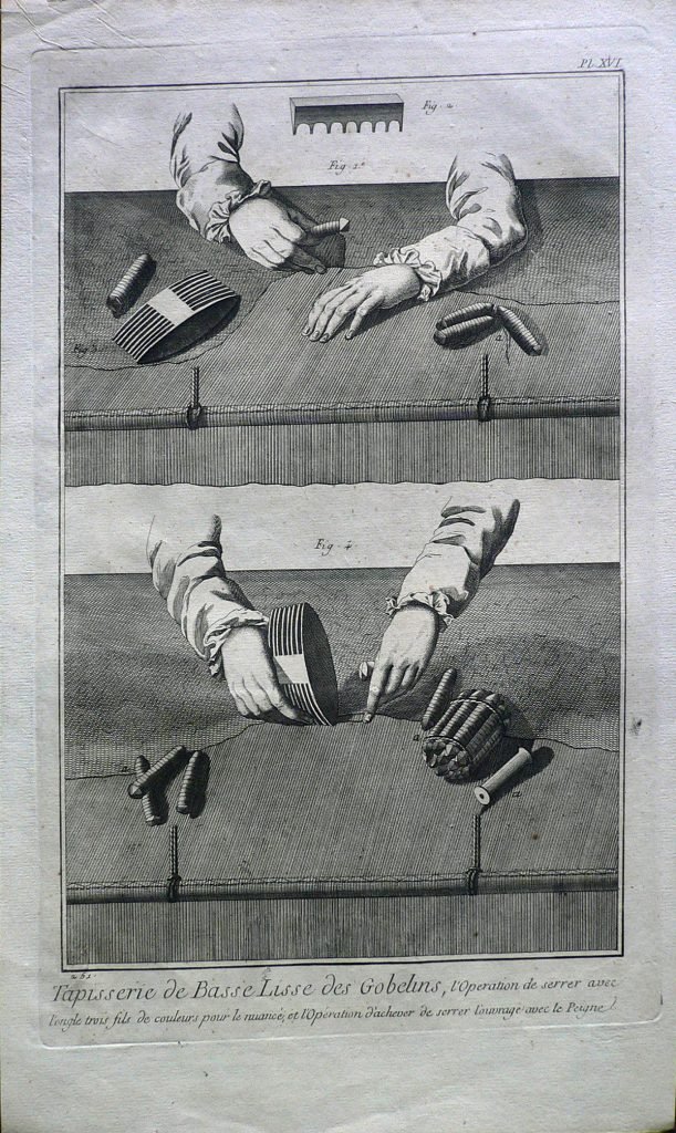 Sono rappresentati in successione i passaggi per la realizzazione della trama. Ogni figura è connotata da: “fig.”; ogni parte da lettere. Filigrana: BEINETTE. E’ presente numerazione della stampa: Pl.XVI.-251; in alto, a sinistra, in matita: 50/12 e 15 (cerchiato); timbro Collezione Piero Malossi.