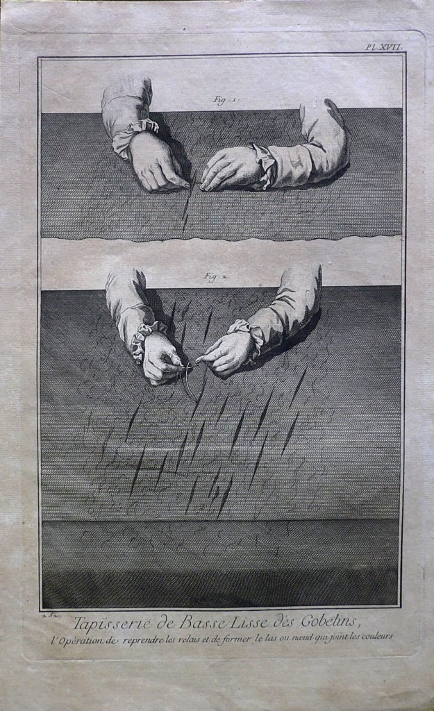 Sono rappresentati in successione i passaggi per la realizzazione della trama. Ogni figura è connotata da: “fig.”. Filigrana: sole. E’ presente numerazione della stampa: Pl.XVII.-252.; in alto, a sinistra, in matita: 49/12 e 15 (cerchiato); timbro Collezione Piero Malossi.