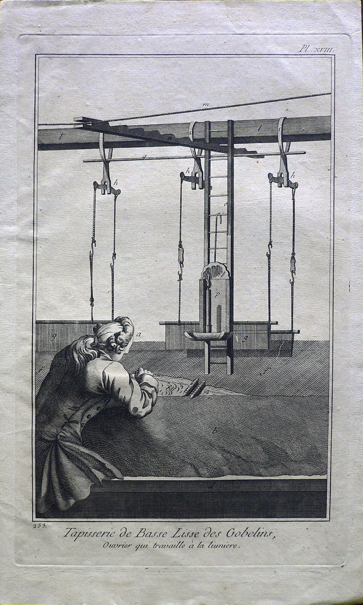 E’ rappresentato un operaio mentre sta lavorando alla luce di una candela. Ogni figura è connotata da: “fig.”; ogni parte da lettere. Filigrana: sole. E’ presente numerazione della stampa: Pl.XVIII.-253.; in alto, a sinistra, in matita: 49/12 e 15 (cerchiato); timbro Collezione Piero Malossi.