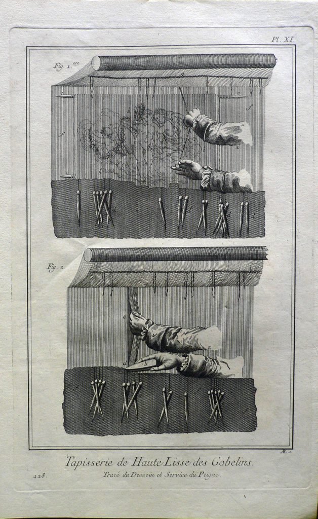 Sono rappresentati in successione due passaggi nella realizzazione dell’arazzo: nel primo è stato tracciato il disegno, nel secondo, l’operaio si serve del pettine. Ogni figura è connotata da: “fig.”; ogni parte da lettere. E’ presente numerazione della stampa: Pl.XI.-228. In alto a sinistra, in matita: 8/12; timbro Collezione Piero Malossi.