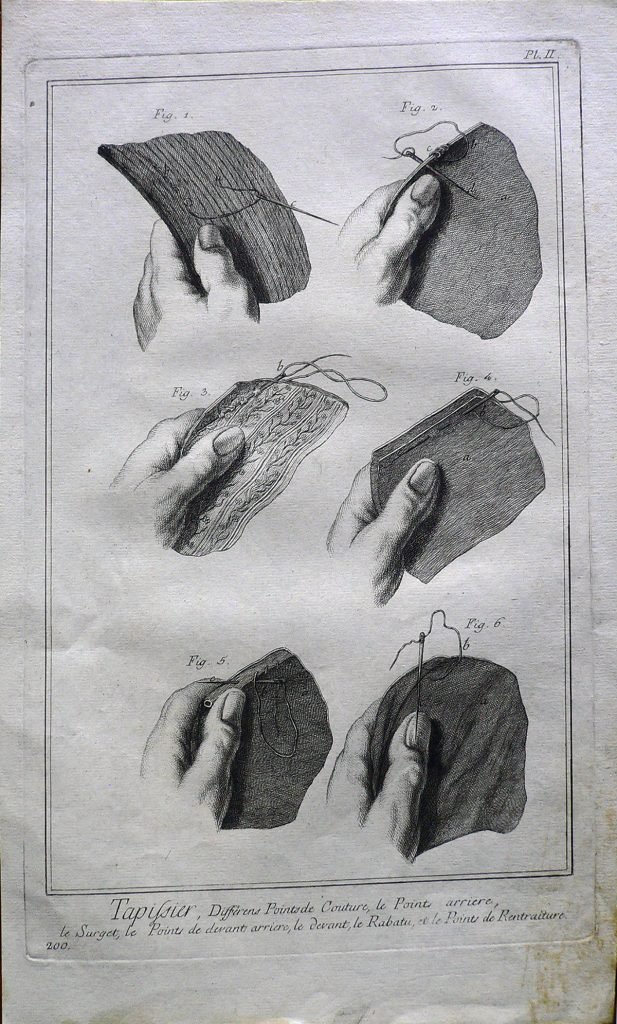 Sono rappresentate in successione sei tecniche di cucito. Ogni figura è connotata da: “fig.”; ogni parte da lettere. Filigrana: sole. E’ presente numerazione della stampa: Pl.II.-200. In alto a sinistra, in matita:63/12 e 15 (cerchiato); timbro Collezione Piero Malossi.