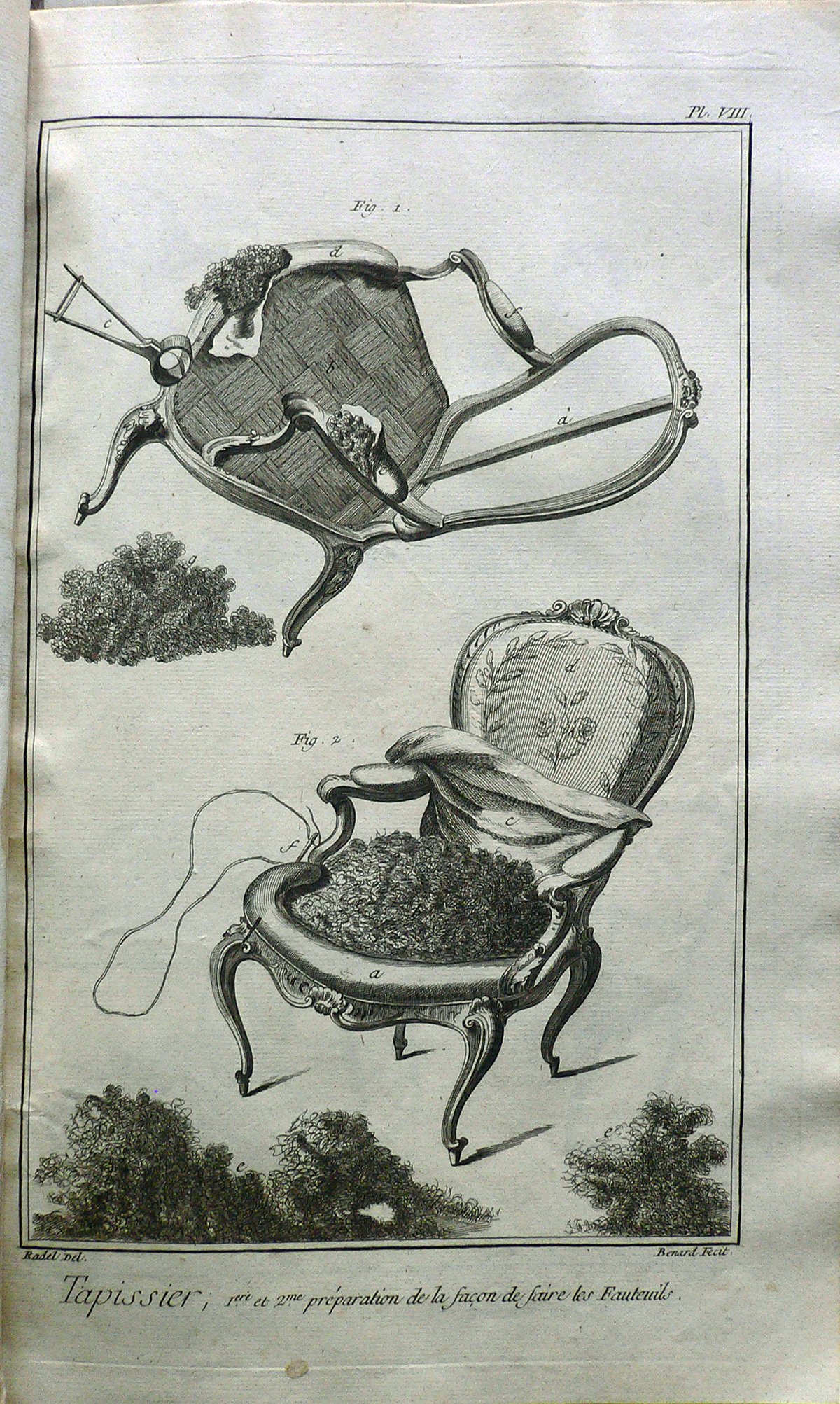 Sono rappresentati i primi due passaggi per l’imbottitura di una poltrona. Ogni figura è connotata da: “fig.”; ogni parte da lettere. Filigrana: indecifrabile. E’ presente numerazione della stampa: Pl. VIII.; la stampa è rilegata in un fascicolo intilolato: ” Tapissier” insieme alle note di spiegazione di ogni Planche.