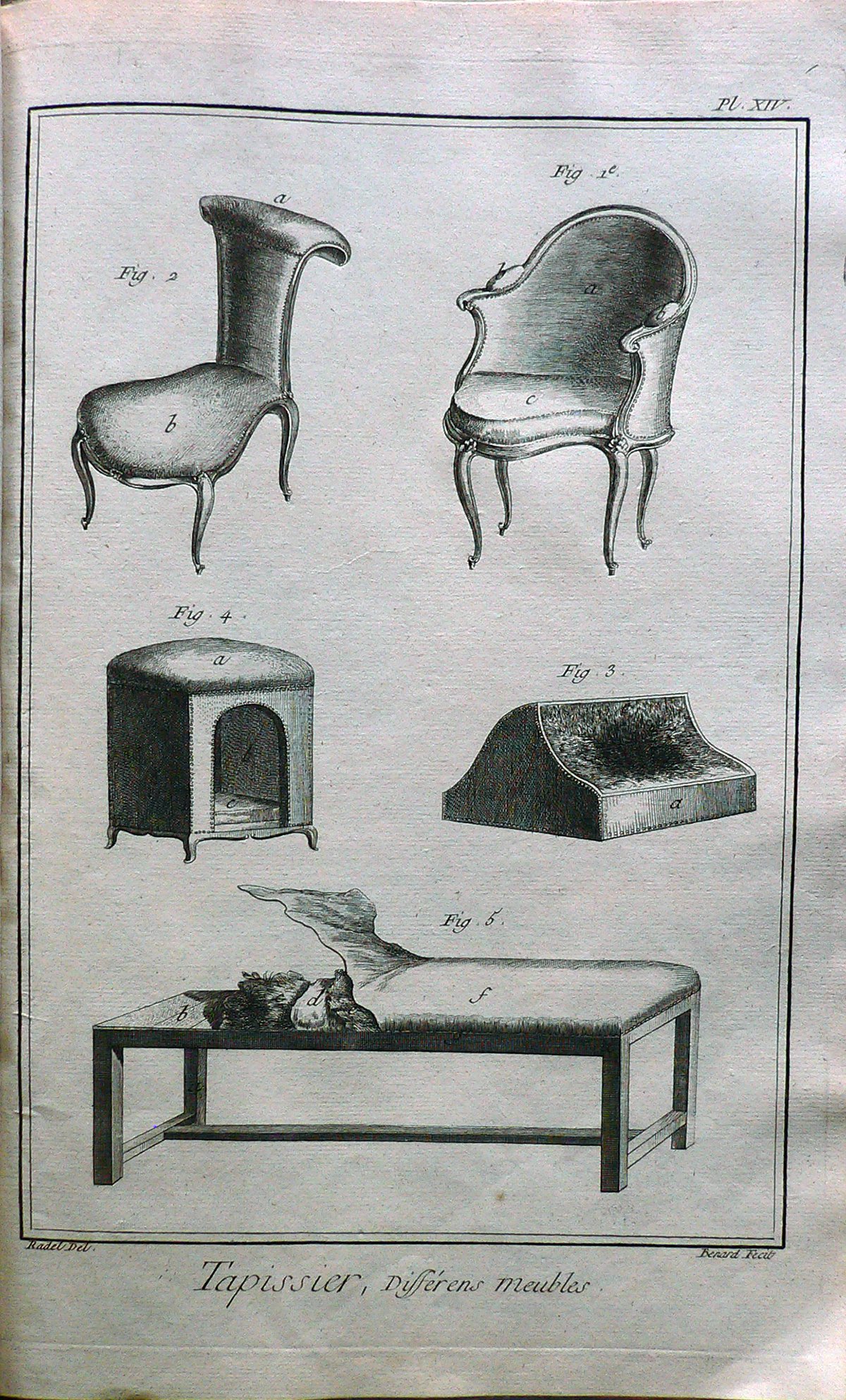 Sono rappresentate cinque immagini: le prime due sono poltrone, l’ultima una panca di legno rivestita di tessuto con tre diverse imbottiture. Ogni figura è connotata da: “fig.”; ogni parte da lettere.Filigrana: indecifrabile. E’ presente numerazione della stampa: Pl. XIV.; la stampa è rilegata in un fascicolo intilolato: ” Tapissier” insieme alle note di spiegazione di ogni Planche.