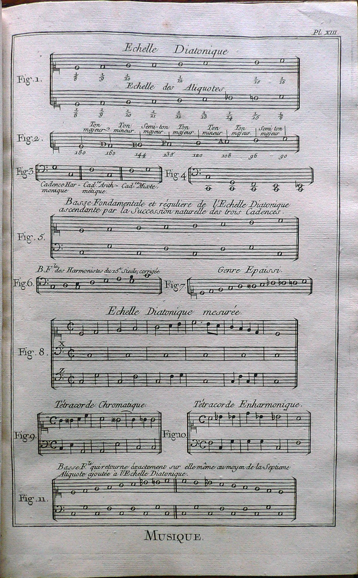 Sono rappresentate undici figure che spiegano le regole armoniche. Ogni figura è connotata da: “fig.”. E’ presente numerazione della stampa: Pl.XIII.; la stampa è rilegata in un fascicolo intilolato: ” Tapissier” insieme alle note di spiegazione di ogni Planche.