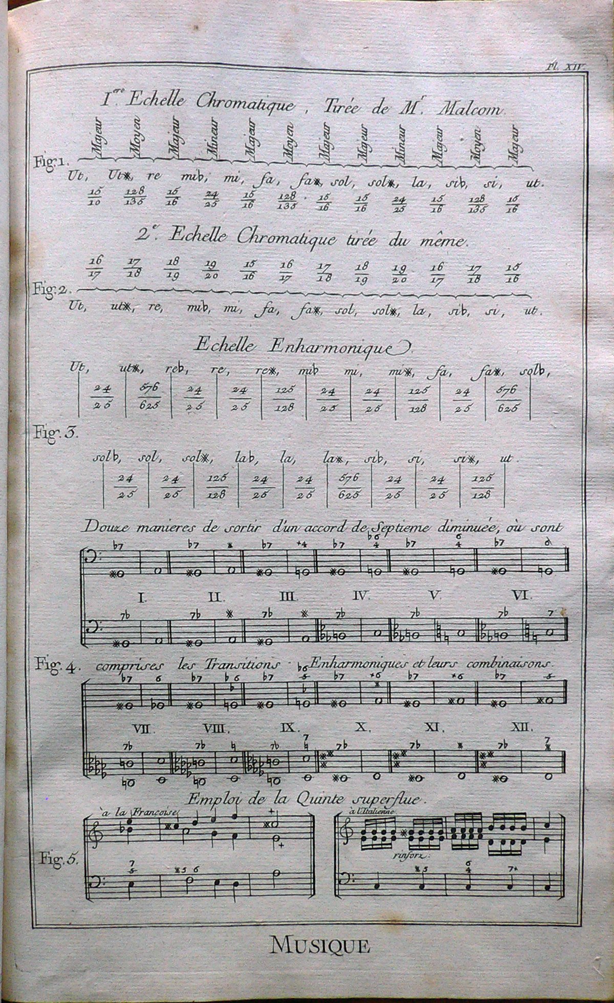 Sono rappresentate cinque figure che spiegano le regole armoniche. Ogni figura è connotata da: “fig.”. Filigrana: indecifrabile. E’ presente numerazione della stampa: Pl.XIV.; la stampa è rilegata in un fascicolo intilolato: ” Tapissier” insieme alle note di spiegazione di ogni Planche; timbro Collezione Piero Malossi; in alto a sinistra, in matita: 29; sul foglio di rilegatura in fondo: “Libro di Piero Malossi._ Brescia 1960.”