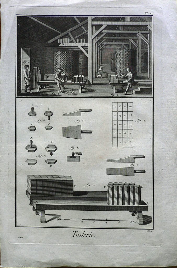 Nel primo riquadro è rappresentato l’interno di una fabbrica di tegole e mattonelle. Sotto arnesi di lavorazione. Ogni figura è connotata da: “fig.”; ogni parte da lettere.Filigrana: arco con freccia. E’ presente numerazione della stampa: Pl.II.-209.; in alto a sinistra, in matita: 83/12.