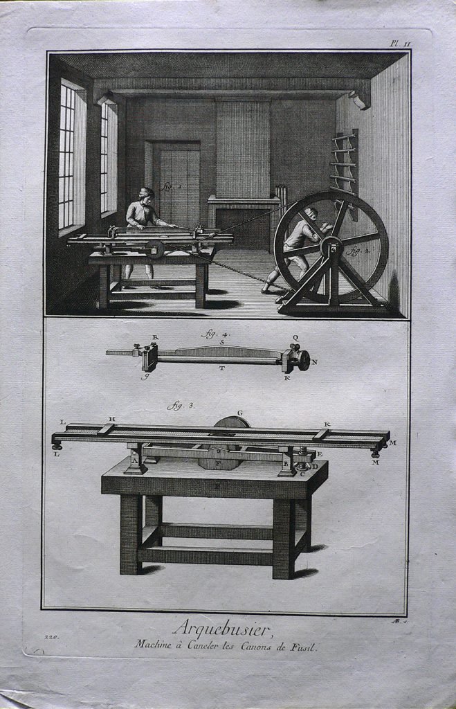 Nella parte superiore scena d’interno, due operai mettono in moto una macchina per la lavorazione delle canne dei fucili. In basso particolare del macchinario. Ogni parte è indicata con lettere e ogni figura è connotata da :”fig.”. Filigrana: segni. E’ presente numerazione della stampa: Pl. II.-220. Sul retro, a matita: 82/12