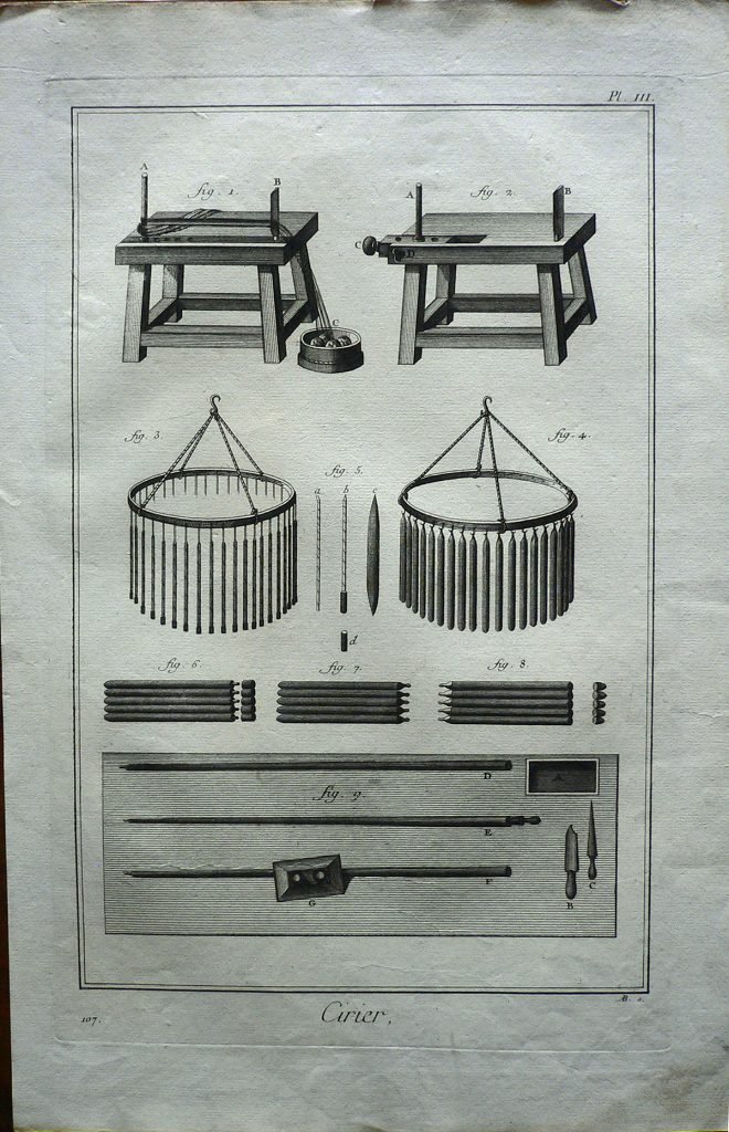 Nella parte superiore e inferiore sono rappresentati gli strumenti perla produzione delle candele, in quella centrale tre serie di diverse candele. Ogni parte è indicata con lettere e ogni figura è connotata da:”fig.”. Filigrana: arco con frecce. E’ presente numerazione della stampa: Pl.III.-107.. e scala metrica. Sul retro, a matita: 7810-1 e 8090