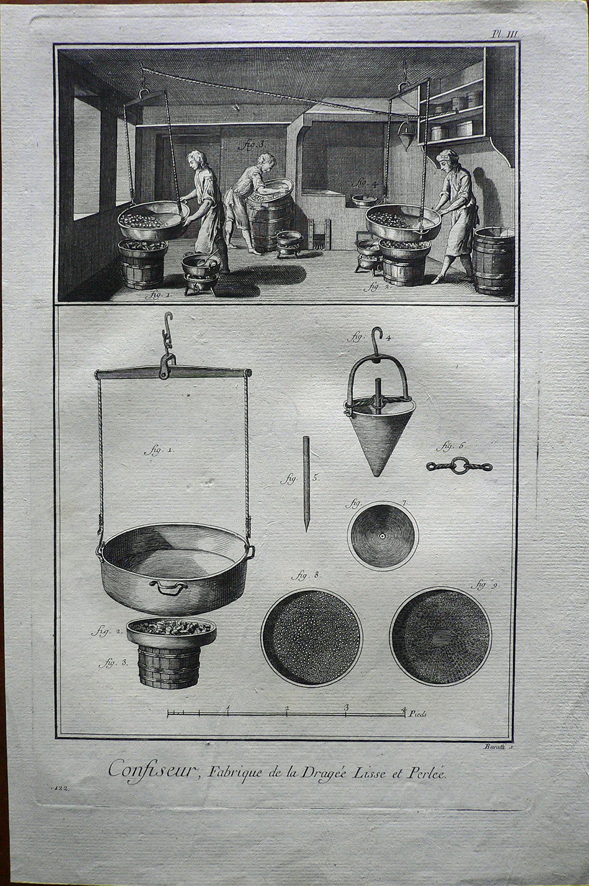 Nella parte superiore sono rappresentati alcuni operai intenti nella lavorazione delle mandorle: due le stanno riscaldando in pentoloni appesi al soffitto, un terzo le settaccia. In basso alcuni strumenti del mestiere. Ogni figura è connotata da:”fig.” Filigrana: tre lune. E’ presente numerazione della stampa: Pl.III.-122.. e scala metrica. Sul retro, a matita: 182/12