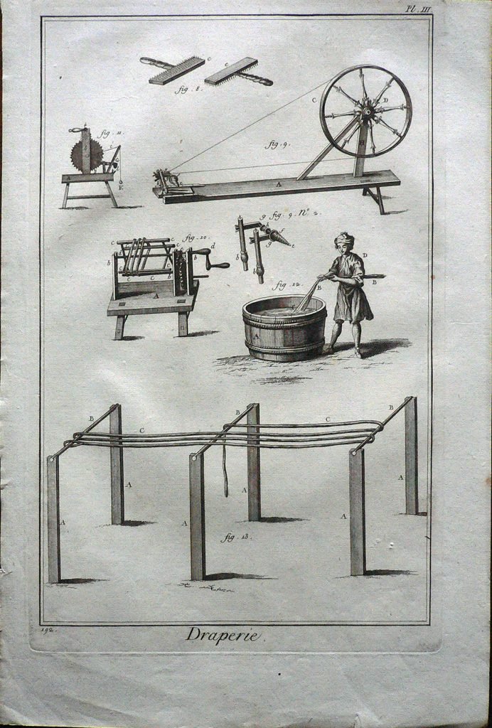La stampa fa parte di una serie di incisioni (345) tratte dall'”Enciclopedia o Dizionario ragionato delle scienze, delle arti e dei mestieri (Encyclopédie ou Dictionnaire raisonné des sciences, des arts et des métiers”). L’enciclopedia fu pubblicata nel XVIII secolo (il primo tomo è del 1751, l’ultimo del 1772), in lingua francese, da un consistente gruppo di intellettuali sotto la direzione di Denis Diderot e con la collaborazione di Jean-Baptiste Le Rond d’Alembert. La sua introduzione, il Discorso Preliminare, è considerata un’importante esposizione degli ideali dell’Illuminismo, nel quale viene esplicitato l’intento dell’opera di incidere profondamente sul modo di pensare e sulla cultura del tempo: “l’opera che iniziamo […] ha due scopi: in quanto enciclopedia, deve esporre quanto più è possibile l’ordine e la connessione delle conoscenze umane; in quanto Dizionario ragionato delle scienze, delle arti e dei mestieri, deve spiegare i principi generali su cui si fonda ogni scienza e arte, liberale o meccanica, e i più notevoli particolari che ne costituiscono il corpo e l’essenza”. Essa costituì il più ponderoso e consapevole compendio – in un certo senso un vero e proprio manifesto – rappresentativo della visione del mondo promossa dal movimento filosofico e culturale passato alla Storia come Illuminismo e finì per incarnare il concetto stesso di enciclopedia come summa complessiva e sistematica delle conoscenze di un’intera cultura, laddove l’impiego di una lingua nazionale si afferma definitivamente come mezzo di descrizione ordinata dell’intero universo del sapere. Le prime ristampe italiane dell’Encyclopédie, in lingua francese, apparvero nella Repubblica di Lucca (tra il 1758 e il 1776) e a Livorno (1770-1778).