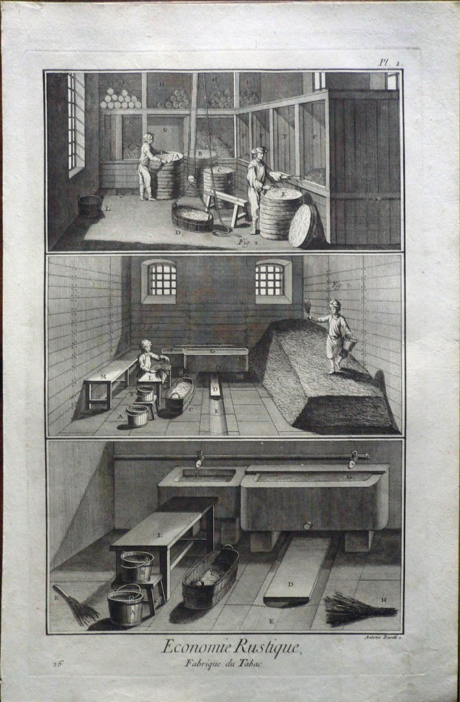 In tre fasce sono rappresentate, in scene d’interno, fasi di lavorazione del tabacco. Ogni parte è indicata da lettere. E’ presente numerazione della stampa: Pl. I.-26.. Sul retro, a matita: 154/12 e 10 (cerchiato); timbro Collezione Piero Malossi.