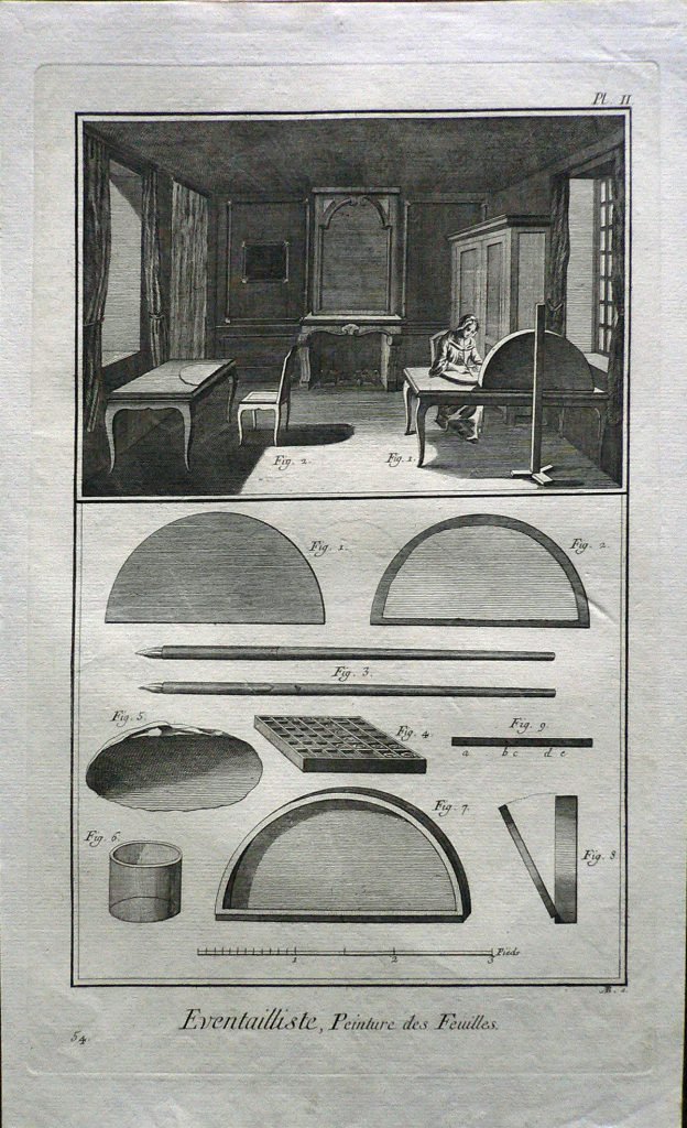 In alto scena d’interno:una donna sta dipingendo ad un tavolo. Sotto alcuni strumenti utilizzati per la decorazione dei ventagli. Ogni figura è connotata da:”fig.” e ogni parte è indicata da lettere. Filigrana: 3 lune. E’ presente numerazione della stampa: Pl.II.-54. e scala metrica. Sul retro, a matita: 259/12