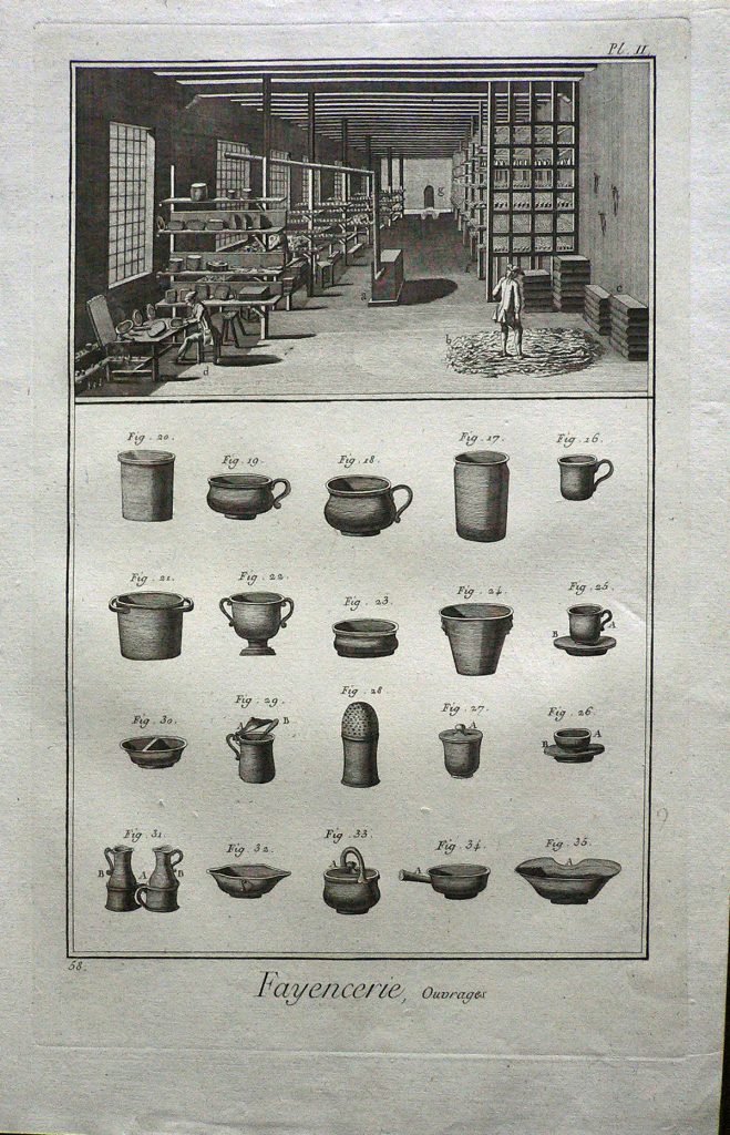 In alto è rappresentato l’interno della fabbrica. Sotto sono illustrate forme di brocche e bicchieri. Ogni figura è connotata da:”fig.” e ogni parte è indicata da lettere. E’ presente numerazione della stampa: Pl.II.-58. Sul retro, a matita: 91/12 e 477-3500
