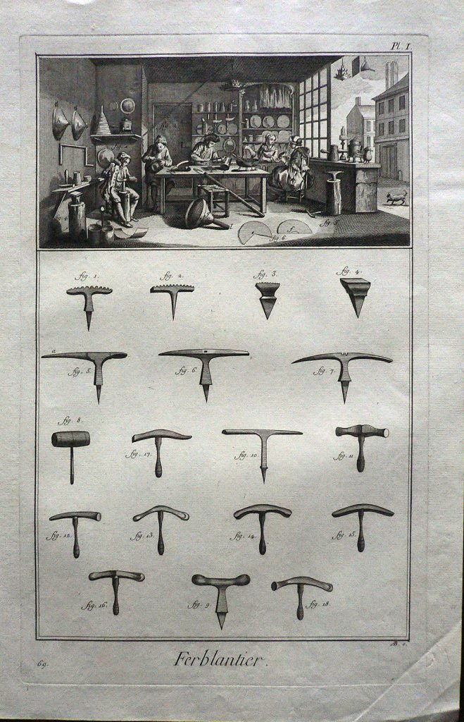 In alto è rappresentato l’interno del negozio di un lattoniere: degli operai lavorano,mentre ad un tavolo, una donna, illustra alcuni oggetti alle sue spalle ad una signora. Sotto gli attrezzi del mestiere. Ogni figura è connotata da:”fig.” e ogni parte è indicata da lettere. Filigrana: lettere maiuscole. E’ presente numerazione della stampa: Pl.I.-69. Sul retro, a matita: 88/12