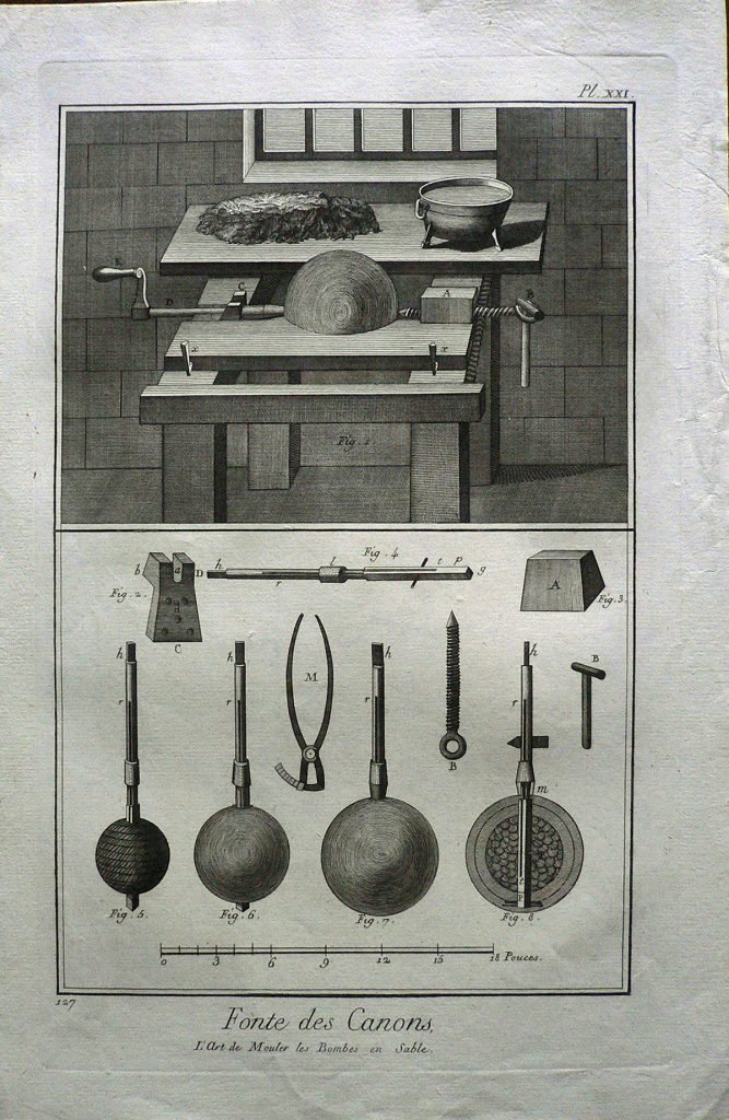 In alto scena d’interno: è rappresentato un tavolo da lavoro per la preparazione delle bombe. Sotto particolari del piano da lavoro e degli strumenti per la realizzazione delle armi. Ogni figura è connotata da:”fig.” e ogni parte è indicata con lettere. E’ presente numerazione della stampa: Pl.XXI.-127. e scala metrica. Sul retro, a matita: 383/12