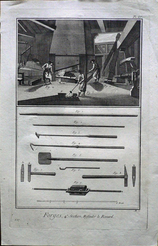 In alto scena d’interno: degli uomini davanti ad un maglio stanno sferzando il metallo per realizzare lo scalpello. Sotto rappresentazione dei alcuni strumenti di lavoro. Ogni figura è connotata da:”fig.”; ogni parte è contraddistinta da lettere. Filigrana: figura umana. E’ presente numerazione della stampa: Pl.V.-128 e scala metrica. Sul retro, a matita: 146/12