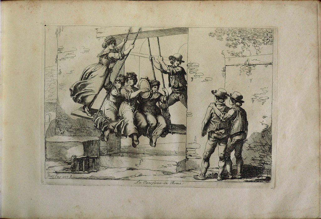 Scena davanti a un casale: sull’altalena cinque persone, due a terra osservano. Presente numerazione della stampa: 11. Stampa rilegata con copertina rigida; sul dorso della copertina: Pinelli Costumi, Roma 1809
