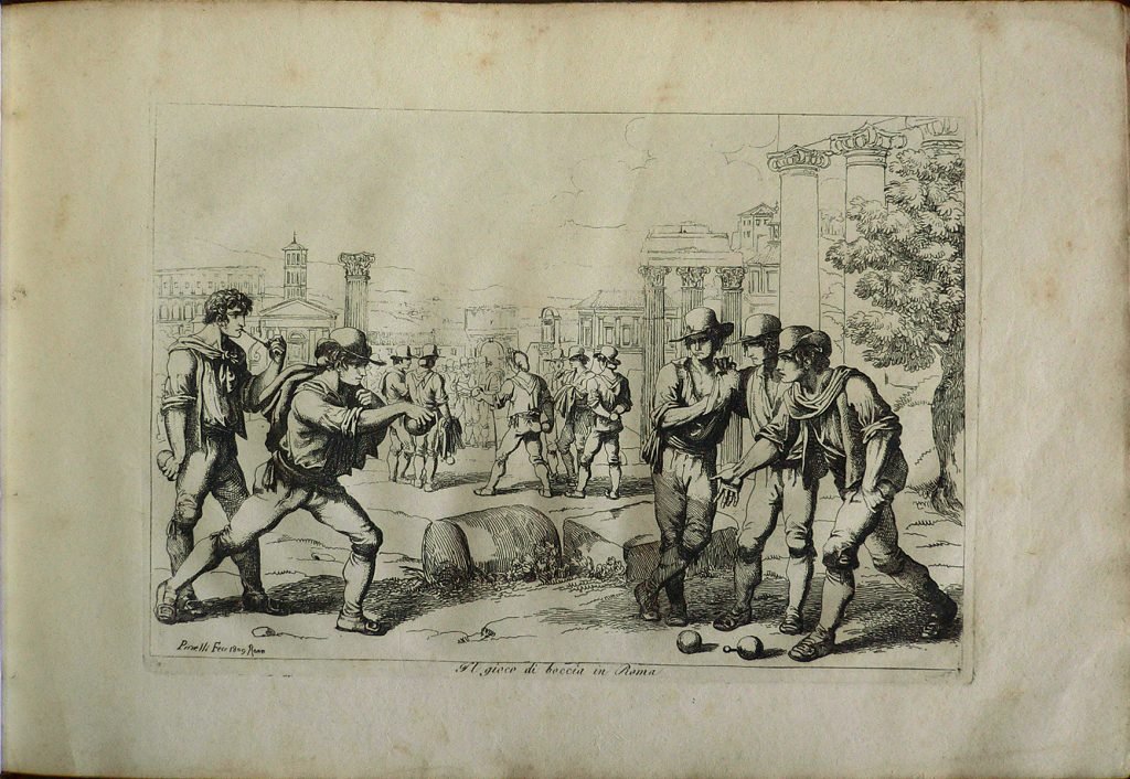 Scena nel prato dei fori a Roma: in primo piano cinque uomini giocano a bocce, sullo sfondo altri uomini sempre intenti nel gioco. Presente numerazione della stampa: 12. Stampa rilegata con copertina rigida; sul dorso della copertina: Pinelli Costumi, Roma 1809