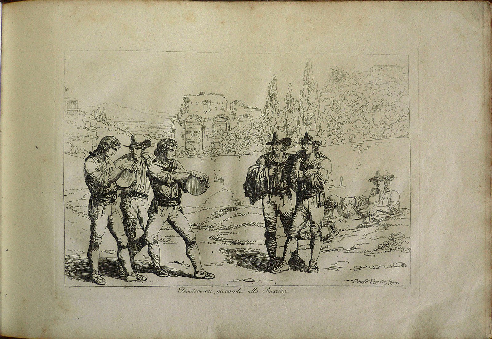 In campagna cinque uomini giocano alla Ruzzica; in secondo piano giovane sdraiato sull’erba li osserva. Presente numerazione della stampa:15. Stampa rilegata con copertina rigida; sul dorso della copertina: Pinelli Costumi, Roma 1809