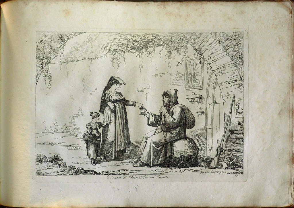 In un antro, sotto una santella, siede un frate che chiede l’elemosina a una donna in abiti eleganti con bambina. Presente numerazione della stampa: 29. Stampa rilegata con copertina rigida; sul dorso della copertina: Pinelli Costumi, Roma 1809
