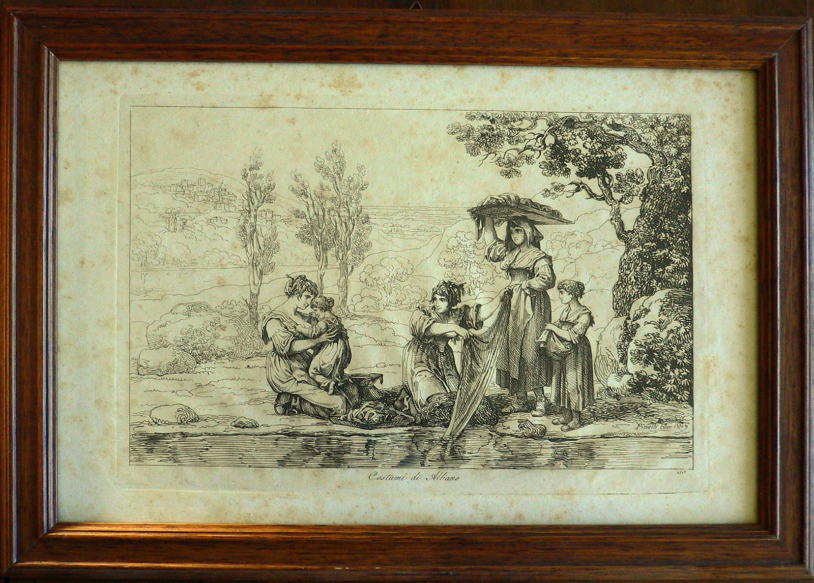 Al fiume: una donna lava i panni, una gioca con la figlia, una porta un asse in testa con i panni e al suo fianco un bambina. Presente numerazione della stampa: 30. Stampa rilegata incorniciata