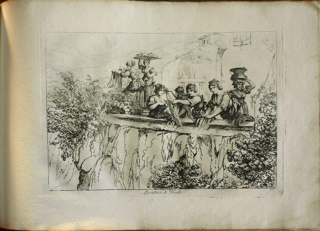 Numerose donne lavano i panni al lavatoio. Presente numerazione della stampa: 32. Stampa rilegata con copertina rigida; sul dorso della copertina: Pinelli Costumi, Roma 1809
