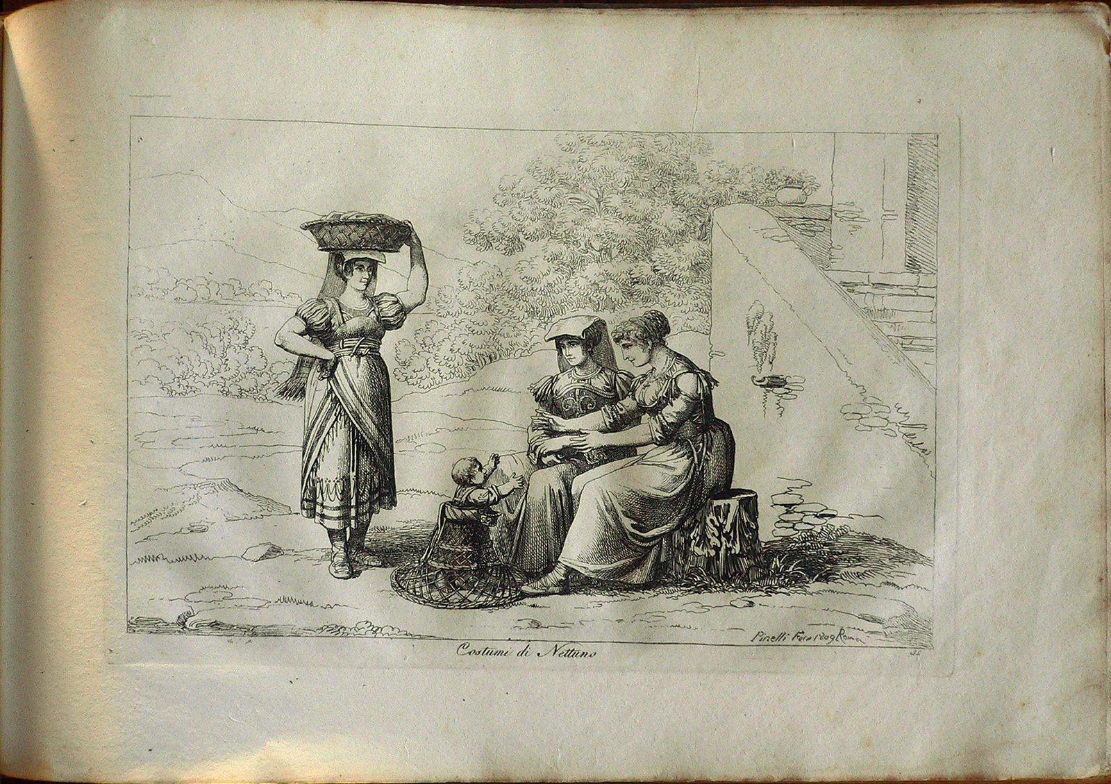 In campagna, tre donne in costumi diversi, due delle quali sedute suI ceppi, giocano con bambino che è dentro a un ” girello”; a sinistra una donna in piedi con cesta sulla testa, a destra scorcio di scala. Presente numerazione della stampa: 31. Stampa rilegata con copertina rigida; sul dorso della copertina: Pinelli Costumi, Roma 1809