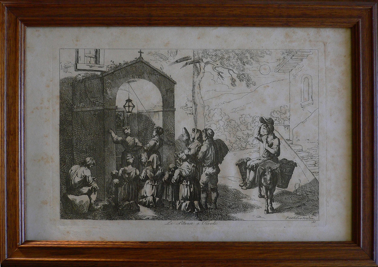Donne e uomini in preghiera di fronte a santella della Madonna, a destra uomo su asino. Sullo sfondo paesaggio collinare con luna e a destra scorcio di casa. Presente numerazione della stampa: 33. Stampa incorniciata