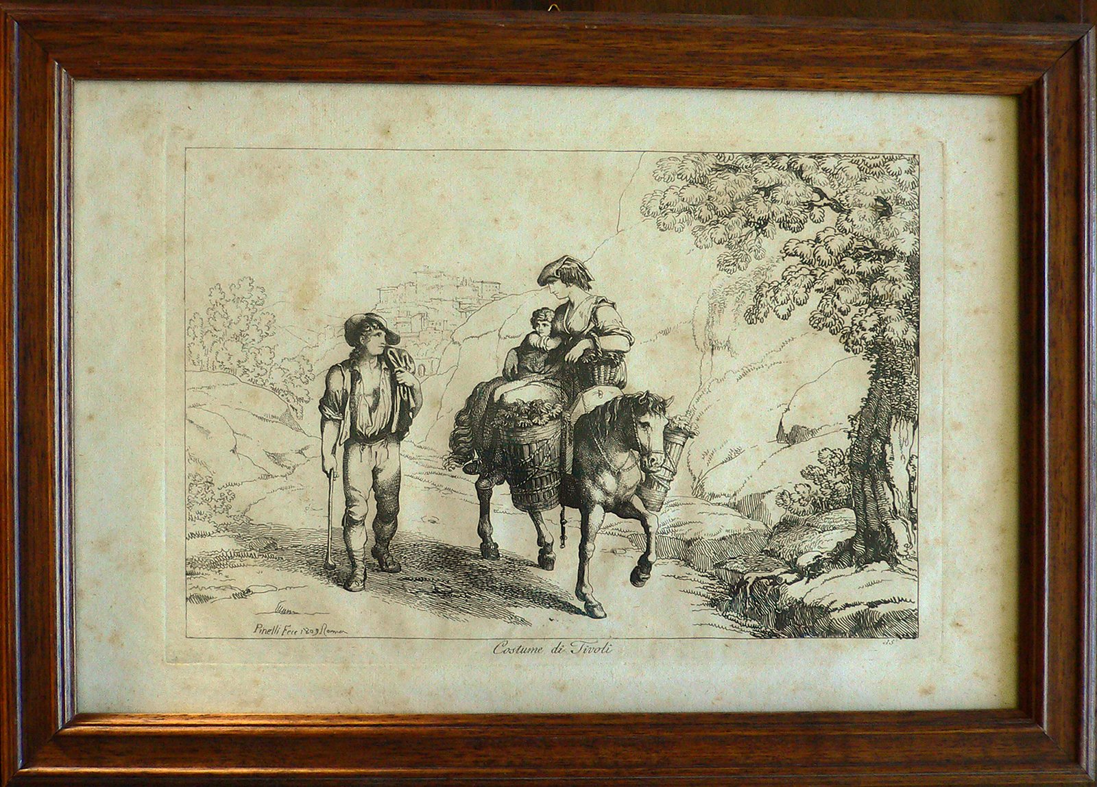 Su strada di campagna, un uomo cammina a fianco di un cavallo su cui stanno donna e bambino, sullo sfondo cittadina. Presente numerazione della stampa: 35. Stampa incorniciata