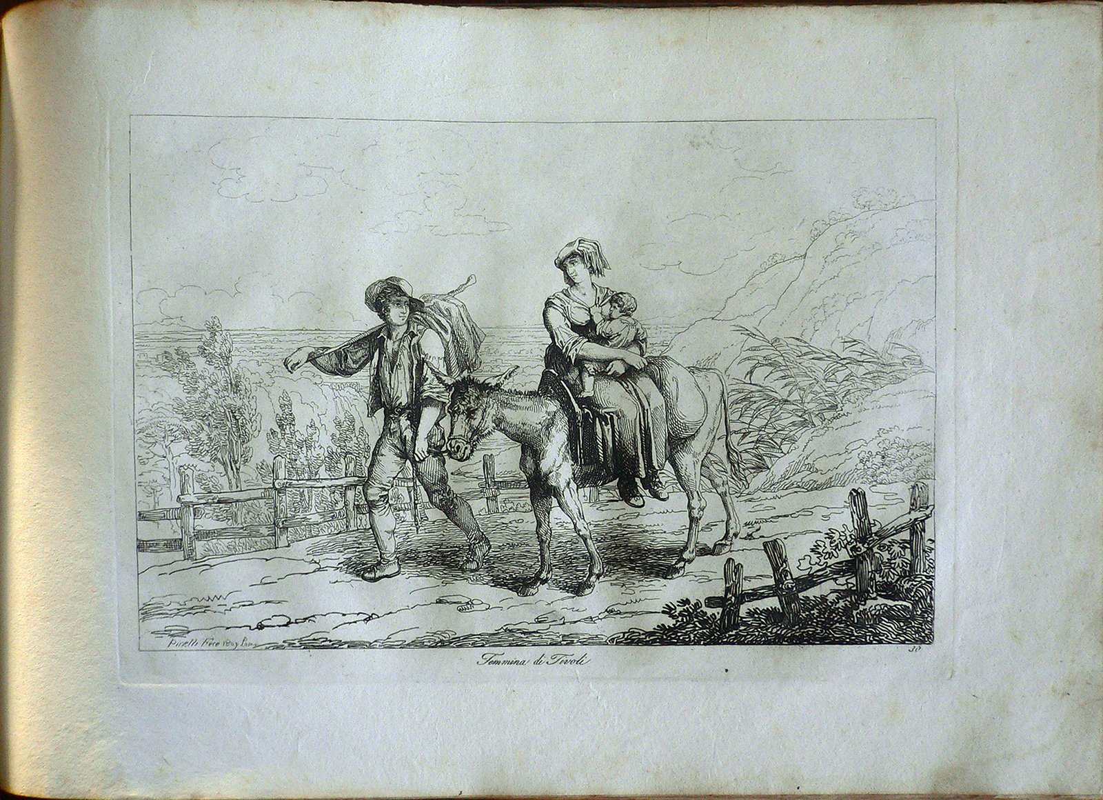 Su strada di campagna, un uomo cammina a fianco di un asino su cui sta una donna che allatta bambino, sullo sfondo campagna. Presente numerazione della stampa: 36. Stampa rilegata con copertina rigida; sul dorso della copertina: Pinelli Costumi, Roma 1809
