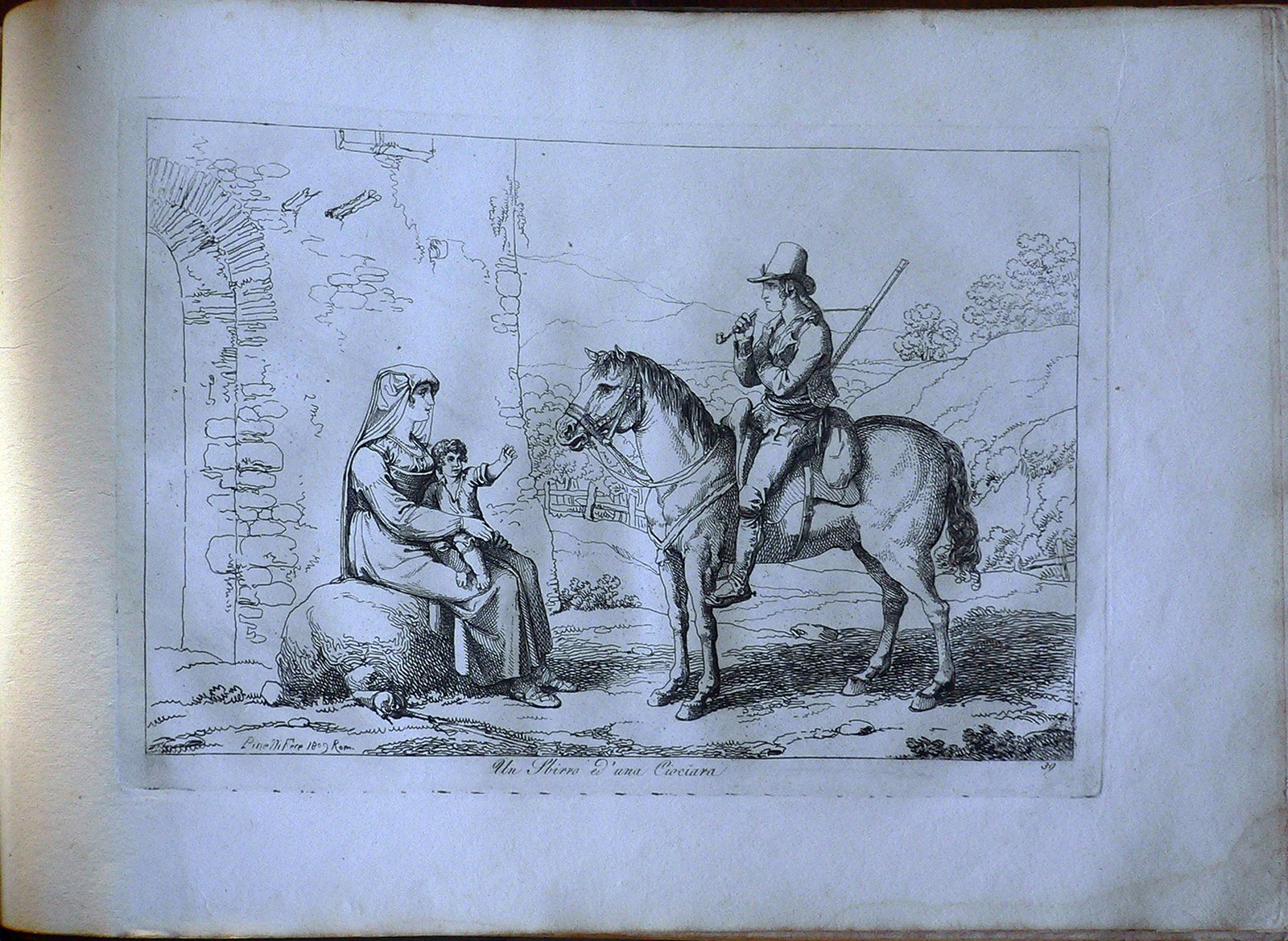 In campagna, davanti a scorcio di cascinale, è seduta una donna con in braccio un bambino, di fronte a lei, a cavallo, uomo con fucile e pipa, sullo sfondo campagna. Presente numerazione della stampa: 39. Stampa rilegata con copertina rigida; sul dorso della copertina: Pinelli Costumi, Roma 1809