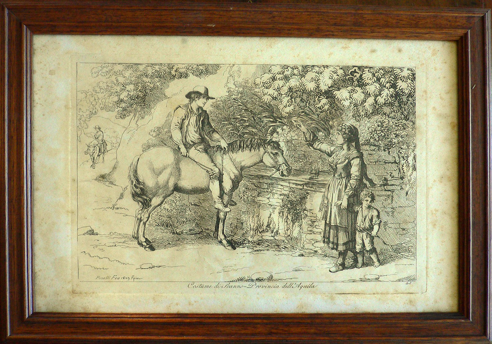 A destra una donna, mano nella mano ad un bambino, saluta un uomo a cavallo, in secondo piano altro uomo a cavallo. La scena si svolge davanti a una fonte. Presente numerazione della stampa: 43. Stampa incorniciata.