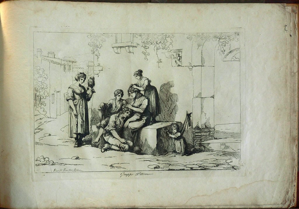 Una donna è seduta su una panchina di pietra e pettina un giovane seduto ai suoi piedi, dietro di lei una bambina la pettina a sua volta, a sinistra un giovane osserva la scena, e una donna fila, a destra una piccola bambina è ad un gancio con un nastro. Presente numerazione della stampa: 48. Stampa rilegata con copertina rigida; sul dorso della copertina: Pinelli Costumi, Roma 1809