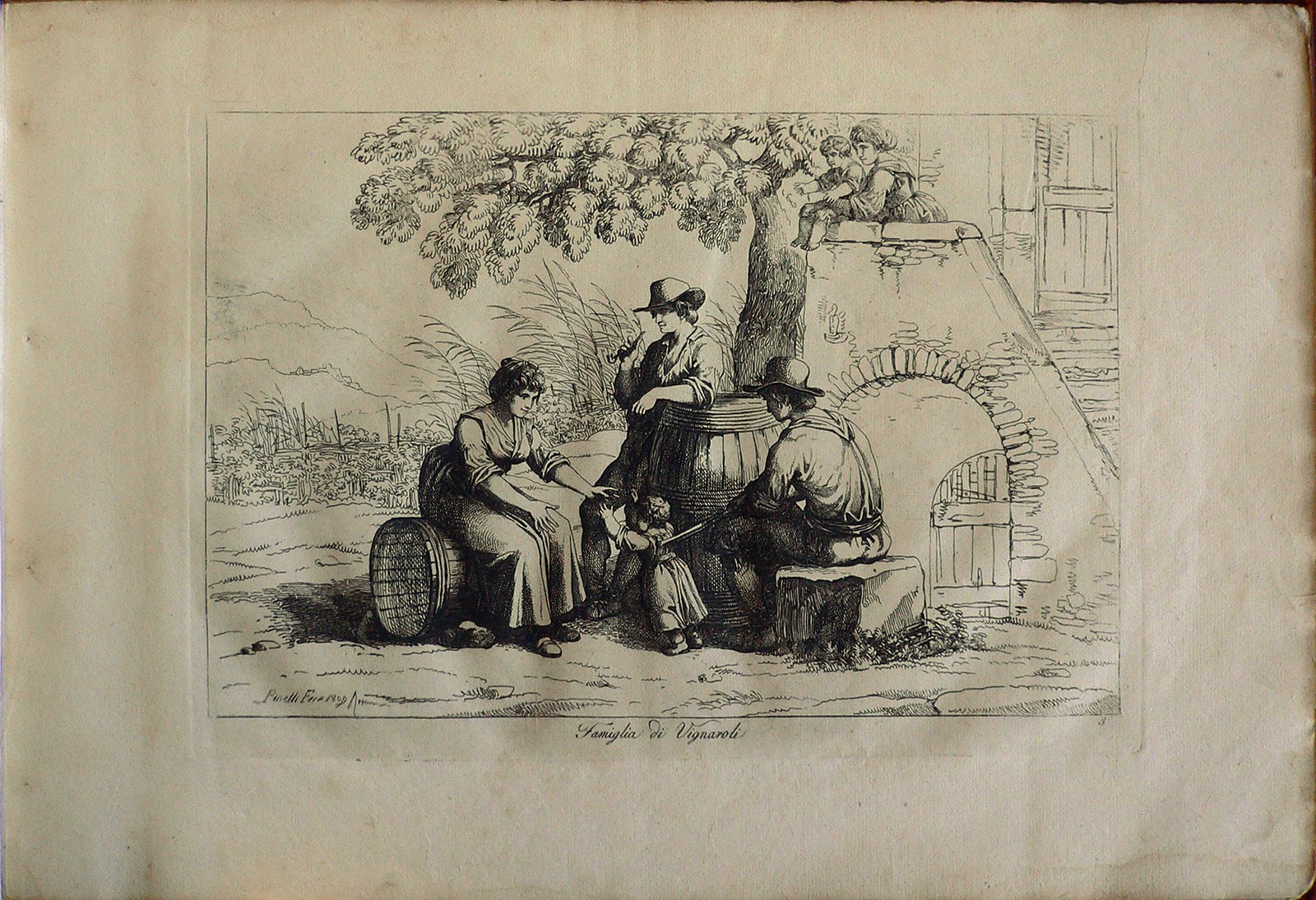 Scena in campagna: al centro famiglia seduta e appoggiata su botti con bambina piccola, a destra scorcio di casale, in cima a scala donna con bambino, sullo sfondo vigna. Presente numerazione della stampa: 5. Presente filigrana: P.M.