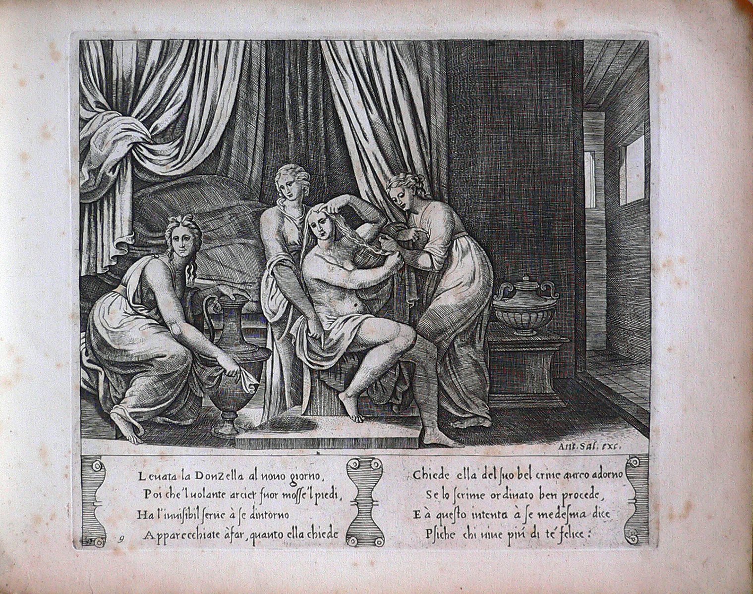 Psiche ai piedi di un letto riceve le cure di tre ancelle. Presenza di doppia numerazione della stampa: 9