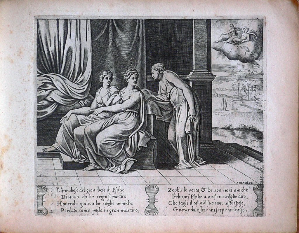 Raccolta di 30 stampe rilegate con copertina. Probabilmente sono la ristampa delle incisioni incise dal Maestro del Dado per l’editore Antonio Salamanca e databili tra il primo e secondo quarto del XVI secolo. Le stampe rappresentano la favola di Amore e Psiche disegnata da Raffaello Sanzio. Testo: ‘L’inuidiose del gran ben di Psiche Di nouo da lor regni si partiro Hauendo già con lor uoglie nemiche Pensato, come porla in gran martiro, Zephir le porta, […] lor con voci amiche Inducon Psiche a un fier consiglio diro, Che tagli il collo al suo non uisto sposo,Giurando essere un serpe velenoso.
