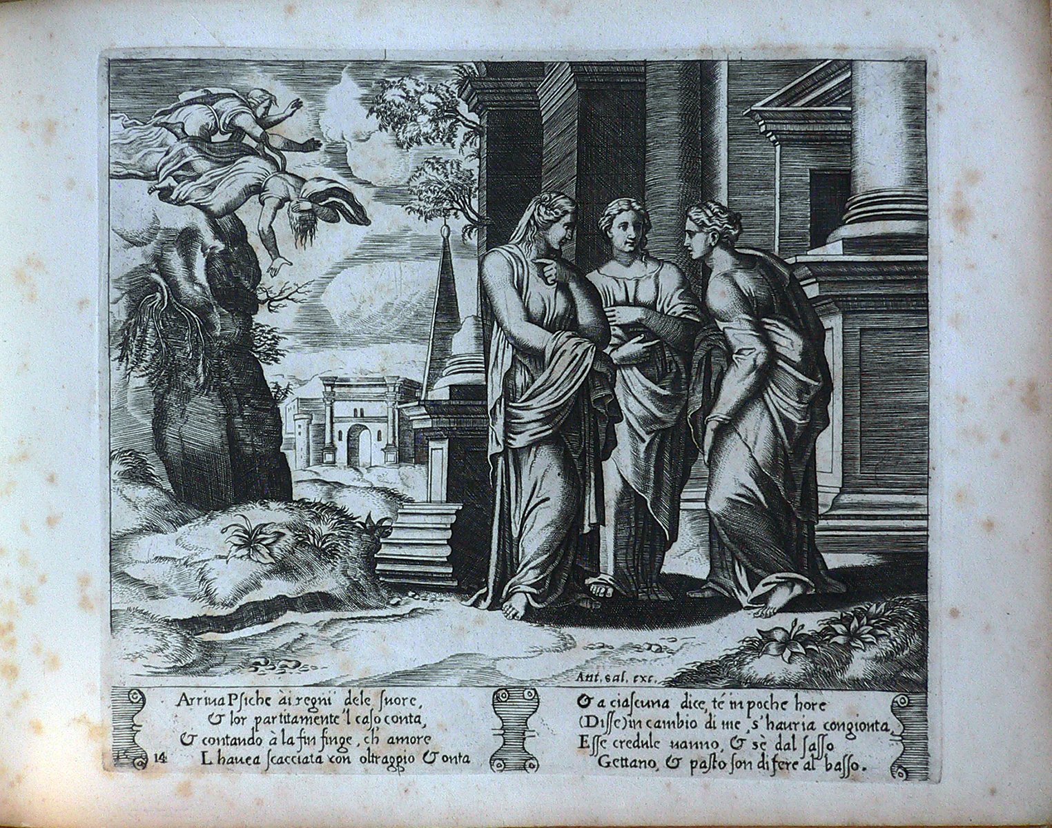 Sequenza: in primo piano, sulla destra, Psiche parla alle sorelle sulla soglia di un edificio. A sinistra le sorelle si gettano da un dirupo. Presenza di doppia numerazione della stampa: 14 e 15