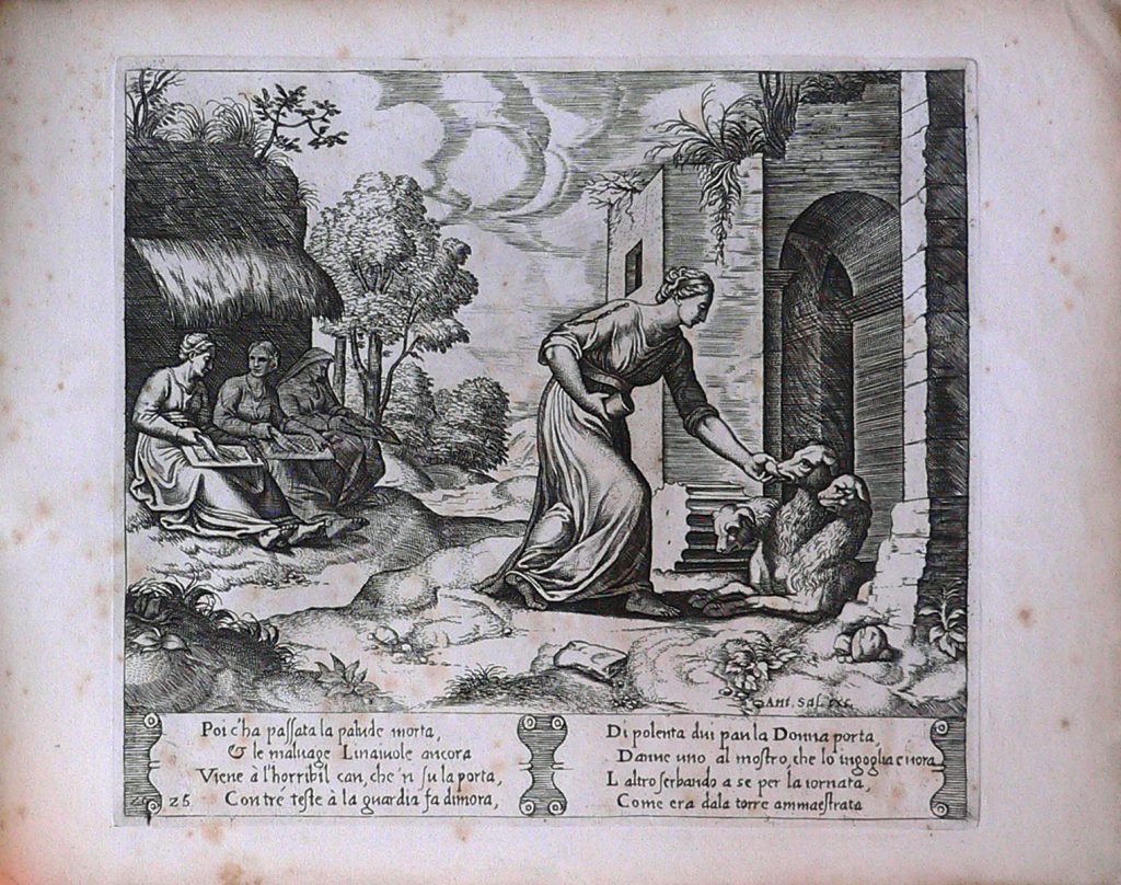 […] le maluage Linaiuole ancora Viene à l’Horribil can, che’ n su la porta, Con tré teste à la guardia fa dimora, Di polenta dui pan la Donna porta, Danne uno al mostro, che lo ingoglia e uora L’ altro serbando a se per la iornata, Come era dala torre ammaestrata