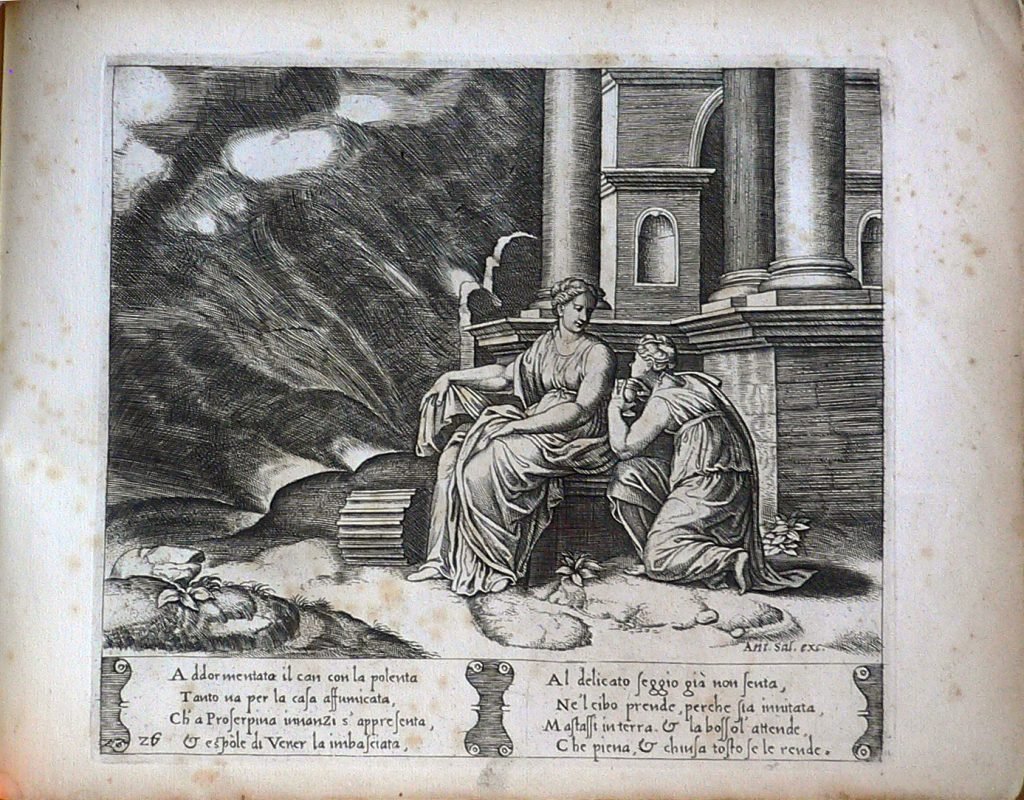 Raccolta di 30 stampe rilegate con copertina. Probabilmente sono la ristampa delle incisioni incise dal Maestro del Dado per l’editore Antonio Salamanca e databili tra il primo e secondo quarto del XVI secolo. Le stampe rappresentano la favola di Amore e Psiche disegnata da Raffaello Sanzio. Testo: Addormentato il can con la polenta Tanto ua per la casa affumicata, Ch’a Proserpina innanzi s’appresenta, […] espòle di Vener la imbasciata, Al delicato seggio già non senta, Ne’l cibo prende, perche sia inuitata, Ma stassi in terra. […] la bossol’attende, Che piena, […] chiusa tosto se le rende.