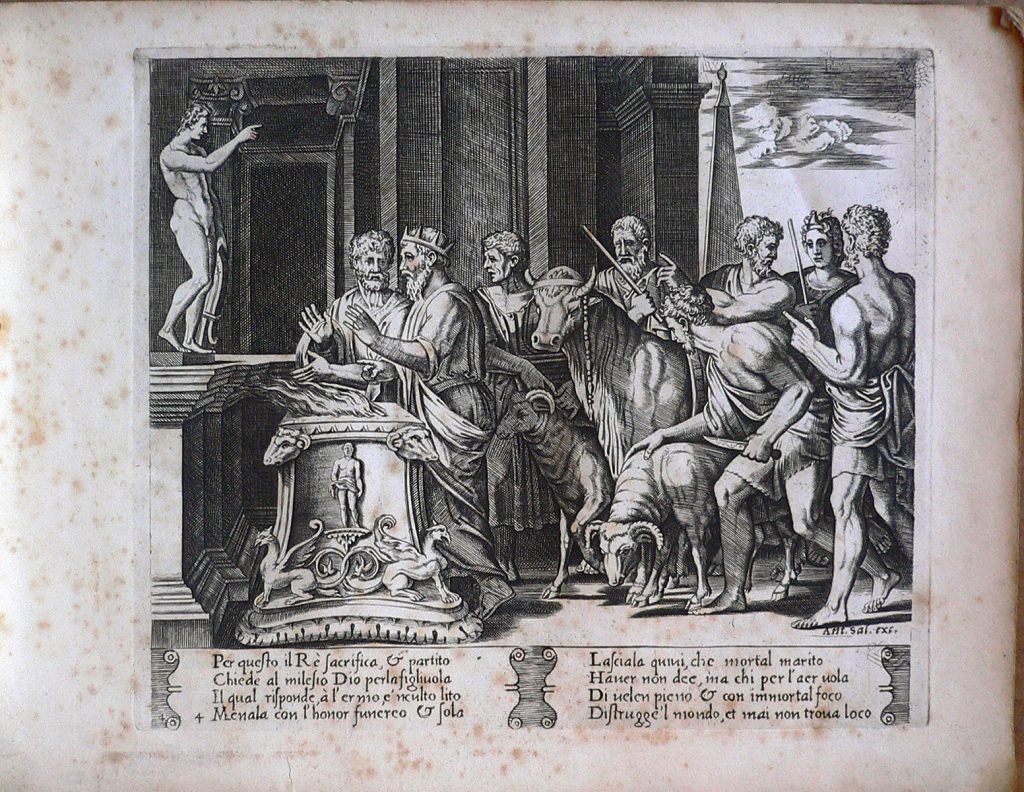 Un re presso un’ara fumante decorata con alto rilievi, grifoni e teste di buoi, consulta la statuetta del dio Apollo. Alle spalle del sovrano uomini, bue e arieti si preparano al sacrificio. Presenza di doppia numerazione della stampa: 4, 4